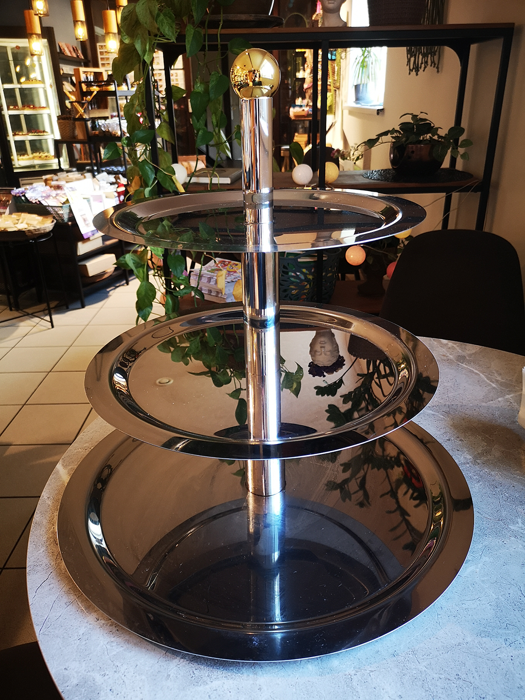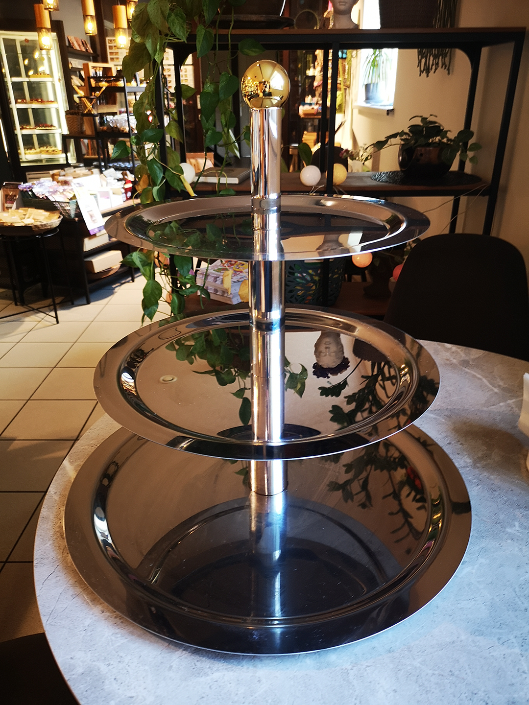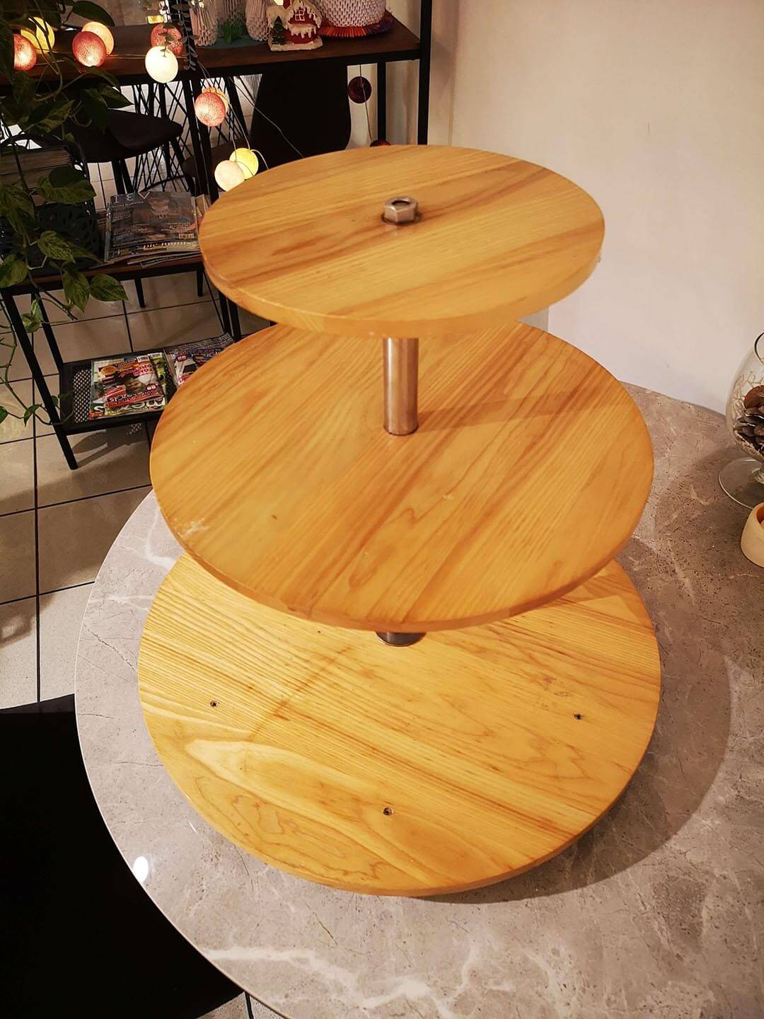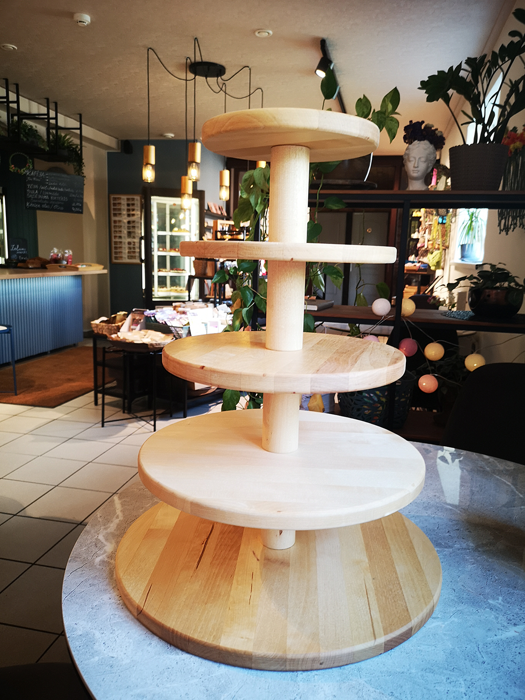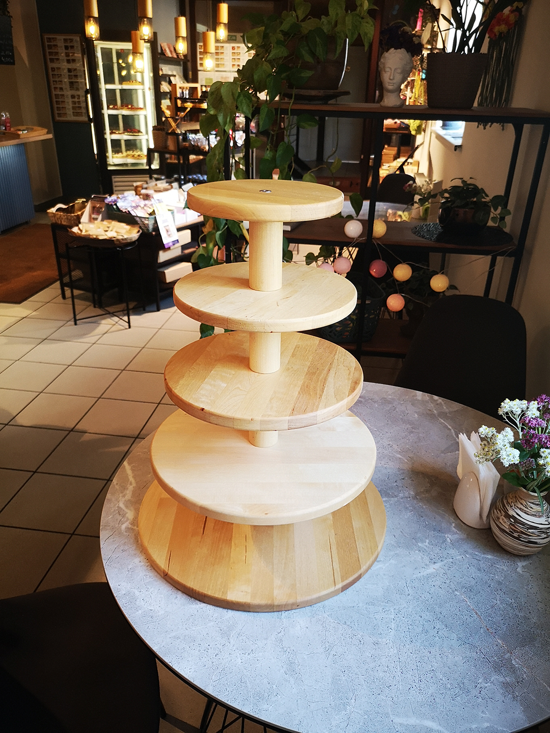 Augstāks, gaiša koka statīvs ar pieciem līmeņiem. Aizņem maz vietas uz galda, bet ietilpina daudz.